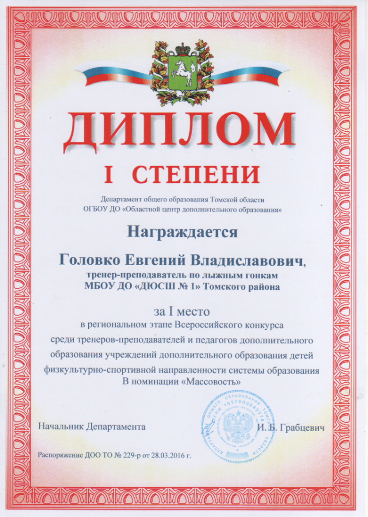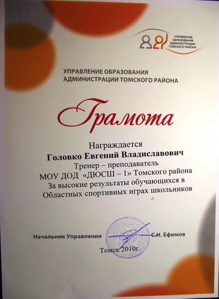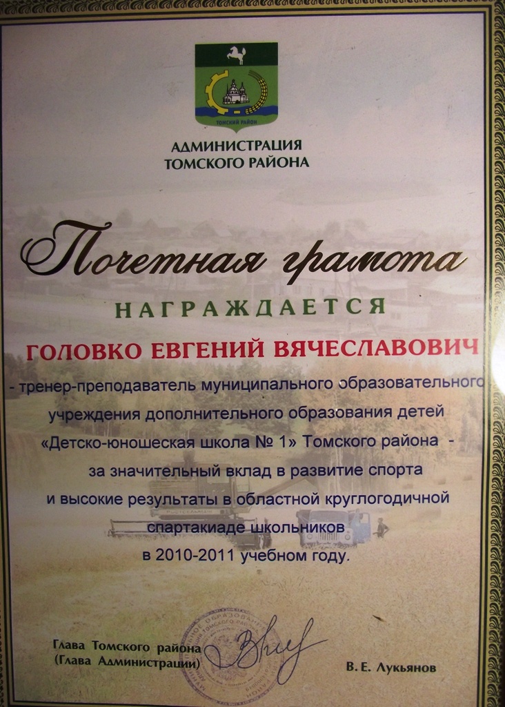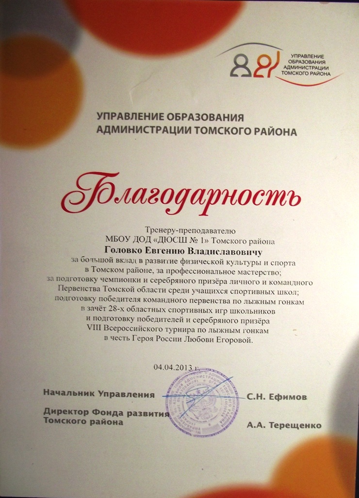 БЛАГОДАРНОСТЬ за большой вклад в развитие физической культуры и спорта в Томском районе, за профессиональное мастерство;  за подготовку чемпионки  и серебряного призёра личного и командного Первенства Томской области среди учащихся спортивных школ; подготовку победителя командного Первенства по лыжным гонкам в зачёт 28-х областных спортивных игр школьников и подготовку победителей и серебряного призёра VIII Всероссийского турнира по лыжным гонкам в честь героя России Любови Егоровой  ПОСМОТРЕТЬ…