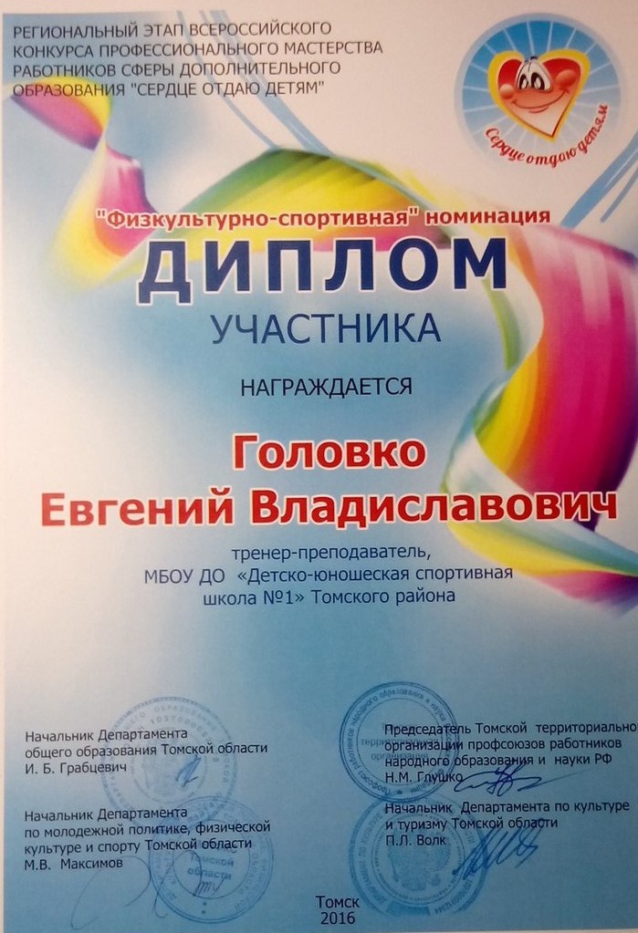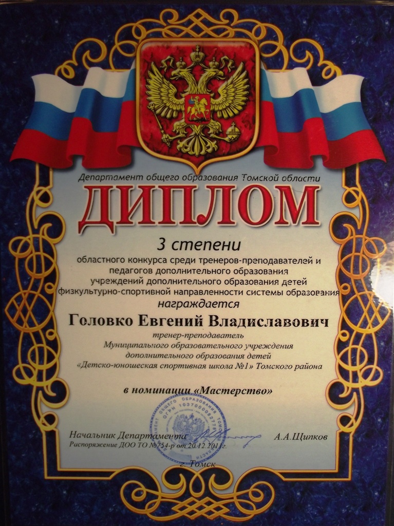 ДИПЛОМ 3 степени областного конкурса среди тренеров-преподавателей и педагогов дополнительного образования учреждений дополнительного образования детей физкультурно-спортивной направленности системы образования  ПОСМОТРЕТЬ…