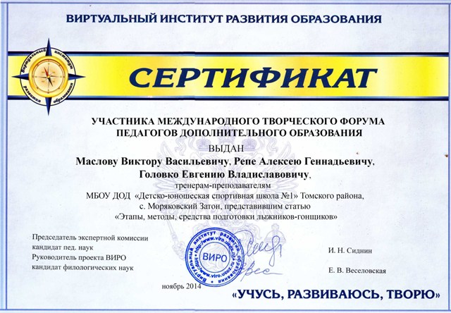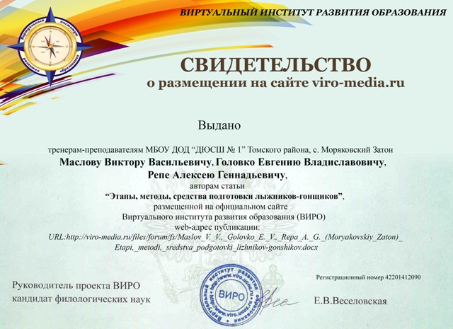 СВИДЕТЕЛЬСТВО  о размещении статьи «Этапы, методы, средства подготовки лыжников-гонщиков» на официальном сайте Виртуального института развития образования (ВИРО)  ПОСМОТРЕТЬ...