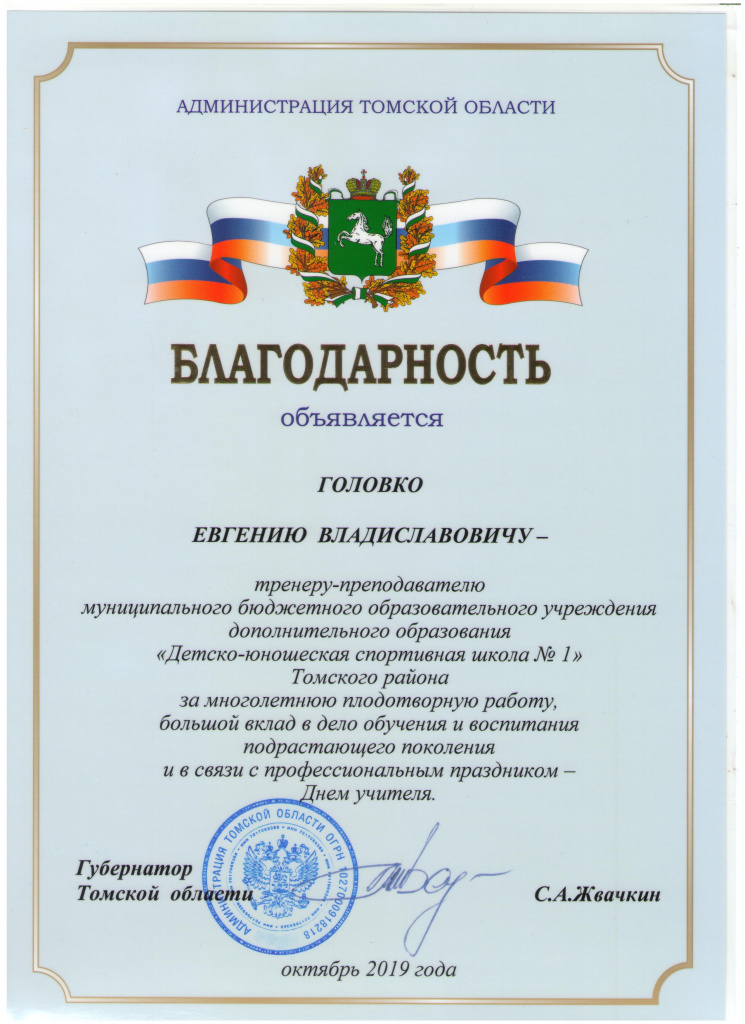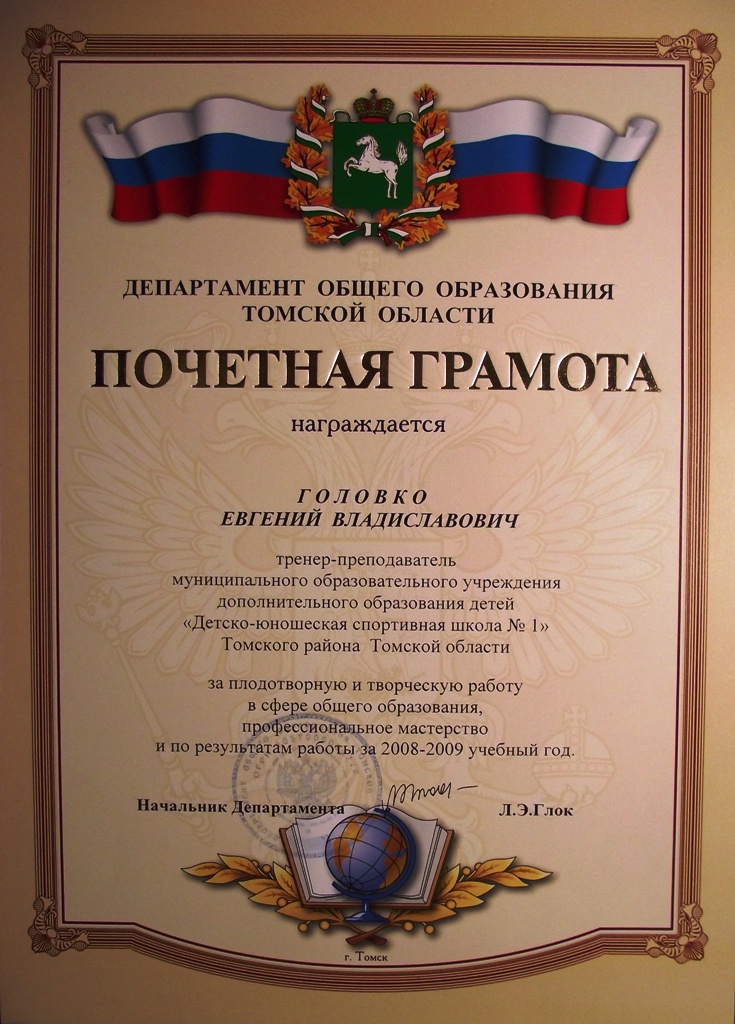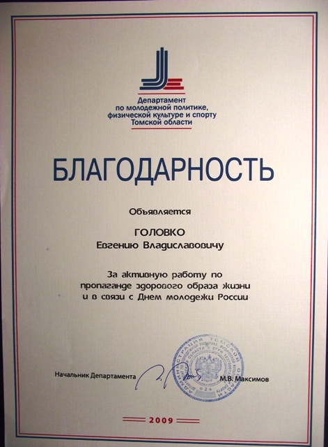 БЛАГОДАРНОСТЬ Департамента по молодежной политике, физической культуре и спорту Томской области за большой вклад и развитие детско-юношеского спорта на территории Томской области и пропаганду здорового образа жизни, а также в связи с 55-летним юбилеем!