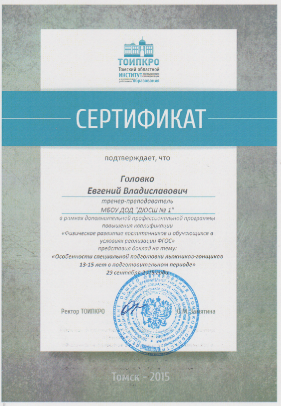 СЕРТИФИКАТ  о предоставлении доклада на тему «Особенности специальной подготовки лыжников-гонщиков 13-15 лет в подготовительном периоде» ПОСМОТРЕТЬ…