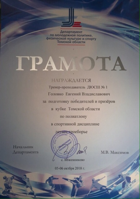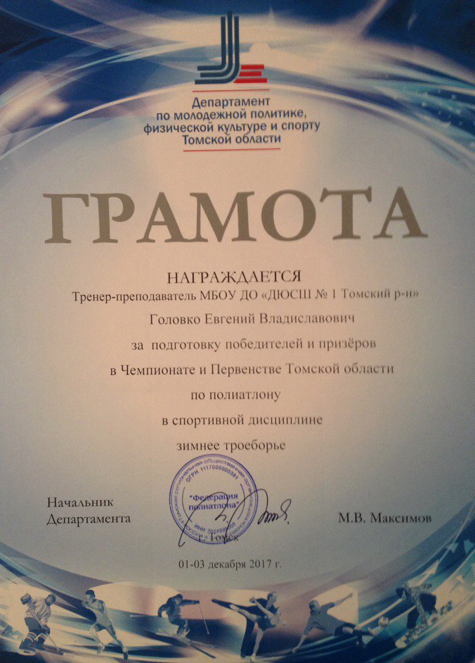 ГРАМОТА Департамента по молодёжной политике, физической культуре и спорту Томской области за подготовку победителей и призеров в Чемпионате и Первенстве Томской области по полиатлону в спортивной дисциплине зимнее троеборье. ПОСМОТРЕТЬ…